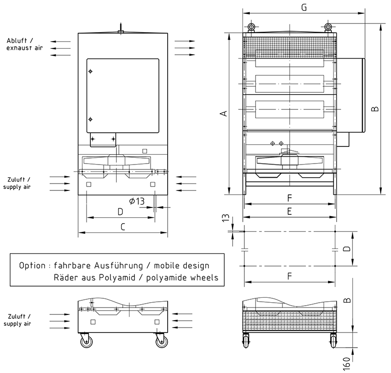 FSV... Steel-grid fixed resistor unit, degree of protection IP 23 with weatherproof roof, for outdoor location, air outlet at the side via air deflectors in the upper area. In completely closed zinc sheet enclosure with barrier grid at the bottom and powered ventilation by an integrated ventilator. With air flow monitoring by wind indicator relay. With attached switched cabinet for controlling the AC and DC loads. Control voltage 230 V AC or 24 V DC is possible.