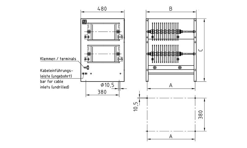 Steel-grid fixed resistor unit, degree of protection IP 00 with 2 side-panel end plates out of zinc plated steel sheet. Ceramic isolated flat or bolt terminals of 35 A up to 400 A in variable combinations available.
