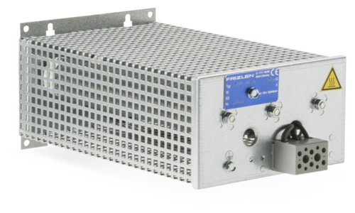 Cemented wirewound tubular fixed resistor in one-tube design, degree of protection IP20, in perforated steel sheet enclosure, mounting vertical to mounting surface, connections optionally at terminals or at screw or fast-on clips at the resistor. For integration into switch cabinets.