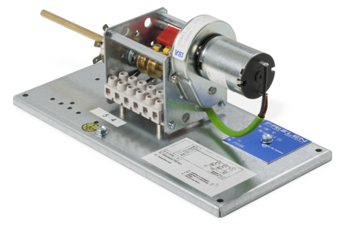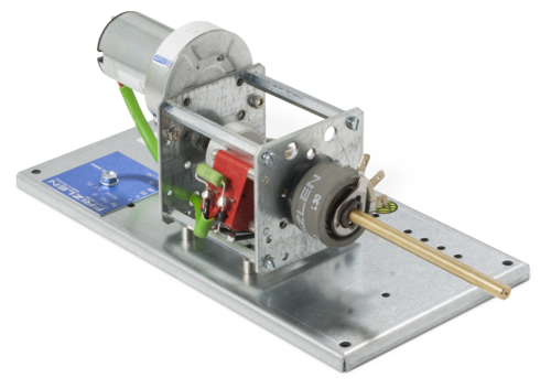 Drehwiderstand mit Antrieb durch Gleichstrommotor 24 V, auf Grundplatte montiert, mit einstellbarer Rutschkupplung zwischen Motor und Widerstand, mit 2 Endschaltern, Motoranschlüsse auf Klemmen geführt, Durchlaufzeit: 8/24/47/90sBesondere Merkmale