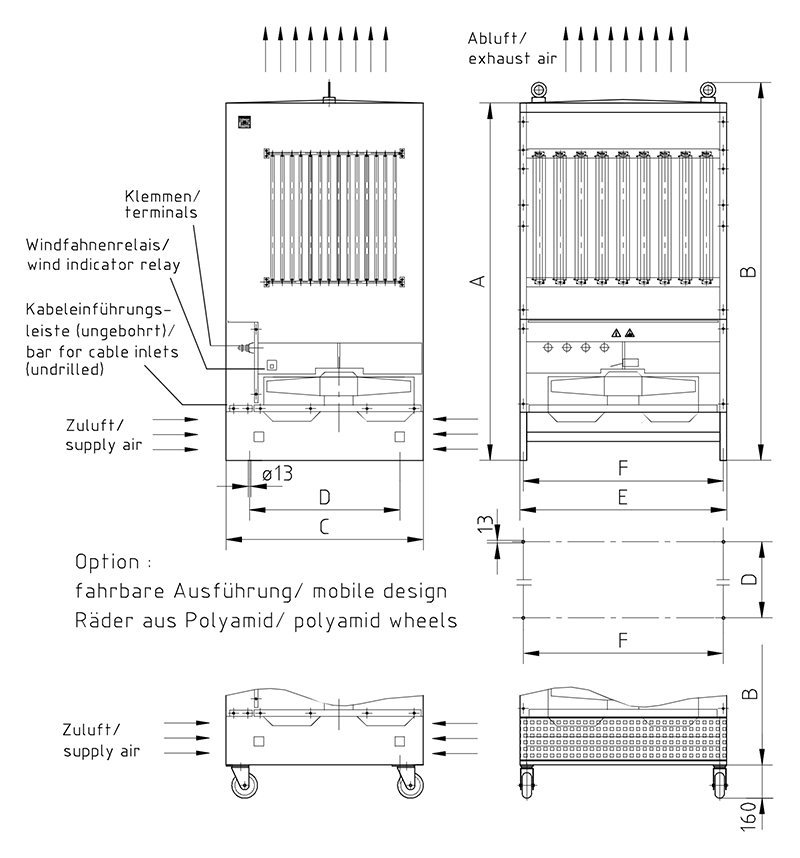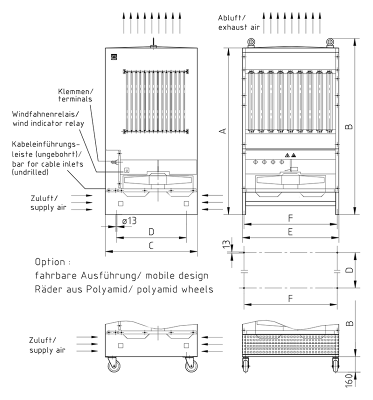 Lamellenfestwiderstandsgerät in Schutzart IP20, ohne Wetterschutzdach, Luftaustritt oben Luftaustritt seitlich über Luftleitbleche im oberen Bereich im verzinkten rundum verschlossenen Stahlblechgehäuse mit Schutzgitter unten und Fremdbelüftung durch eingebauten Ventilator. Mit Luftstromüberwachung durch Windfahnenrelais. Keramikisolierte Flach- oder Bolzenklemmen von 35A bis 400A bei variabler Zusammenstellung.