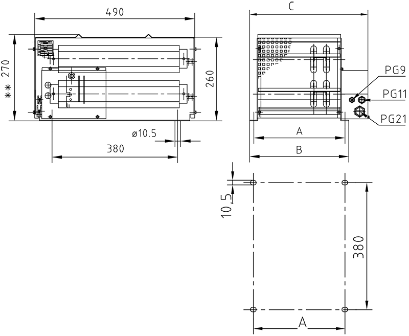 Drahtgewickeltes Lamellenfestwiderstandsgerät in Schutzart IP20 bei Montage auf einer geeigneten Oberfläche, im verzinkten Stahlblechgehäuse mit max. 2 Klemmen verschiedener Art für Widerstand und optional 2 Klemmen für Temperaturschalter, wahlweise im oder am Gehäuse oder im angebauten Klemmenkasten bzw. mit integriertem thermischem Überstromrelais oder DC-Powerswitch.
