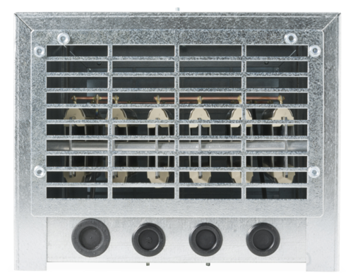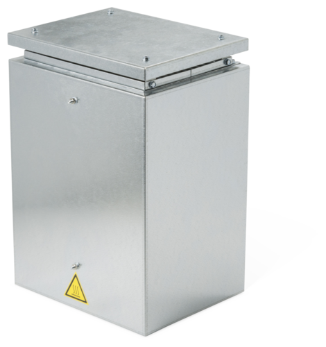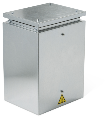 Drahtgewickeltes Lamellenfestwiderstandsgerät in Schutzart IP 23 mit Regenschutzdach im verzinkten Stahlblechgehäuse mit bis zu 12 Klemmen und mehreren Bohrungen für Kabeleinführungen, die durch Gummitüllen verschlossen sind.