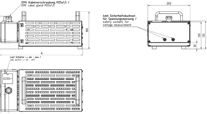 Kurzschlussfester drahtgewickelter Last- und Entladewiderstand zur Belastung von Batterien bzw. Entladung von Kondensatoren. Ausführung in Schutzart IP 20, mit Lastschalter und Sicherheitsbuchsen.