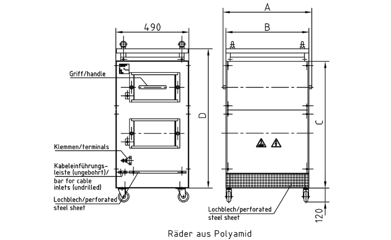Dargestellt ist mobile Ausführung mit Rollen; für Ausführung ohne Rollen siehe Maßbild 16M0043