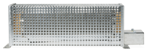 Zementierter drahtgewickelter Rohrfestwiderstand in Ein- bis Dreirohrausführung, in Schutzart IP20 bei Montage auf einer geeigneten Oberfläche, mit Seitenteilen und perforierter Abdeckung, Befestigung parallel zur Montagefläche, mit 2 Anschlüssen verdrahtet auf Klemmen im angebauten Klemmenkasten mit PG11-Kabelverschraubung.