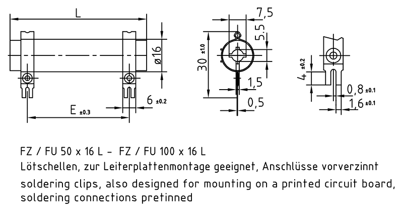 Zementierter drahtgewickelter Rohrfestwiderstand in Schutzart IP00 mit Lötschellen, auch zum Einlöten auf Leiterplatten, Befestigung und Anschluss mittels Lötschellen waagrecht zur Montagefläche. Anschlüsse vorverzinnt.
