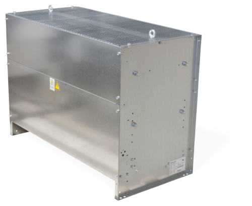 Stahlgitterfestwiderstandsgerät in Schutzart IP20 ohne Wetterschutzdach im verzinkten rundum verschlossenen Stahlblechgehäuse mit Schutzgitter unten und oben. Keramikisolierte Flach- oder Bolzenklemmen von 35 A bis 400 A bei variablem Einbau sind möglich.