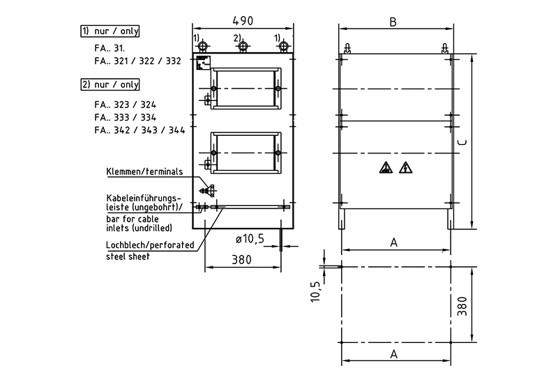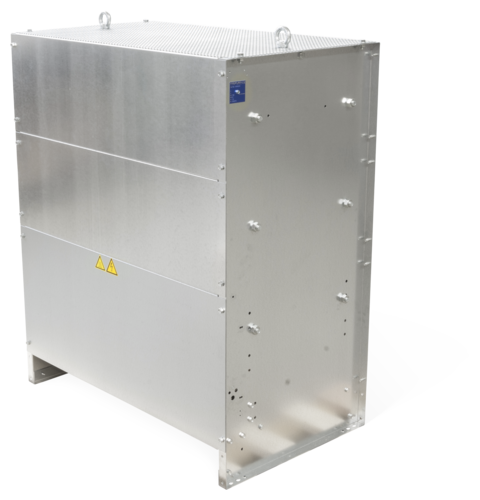 Stahlgitterfestwiderstandsgerät in Schutzart IP20 ohne Wetterschutzdach im verzinkten rundum verschlossenen Stahlblechgehäuse mit Schutzgitter unten und oben. Keramikisolierte Flach- oder Bolzenklemmen von 35 A bis 400 A bei variablem Einbau sind möglich.