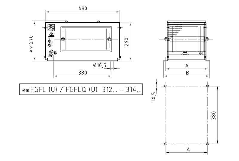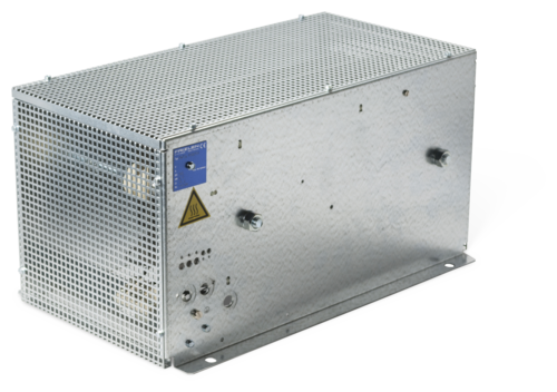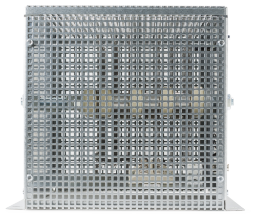 Stahlgitterfestwiderstandsgerät in Schutzart IP20 bei Montage auf einer geeigneten Oberfläche, im verzinkten Stahlblechgehäuse mit mehreren Klemmen bis max. M8 für den Widerstand im Gerät auf Klemmenleiste; Temperaturschalter ist optional möglich (Typ FGFLQ) und wird ebenfalls auf der Klemmenleiste verdrahtet.