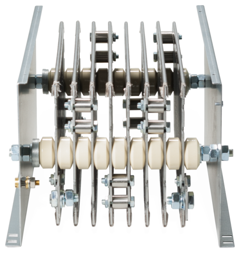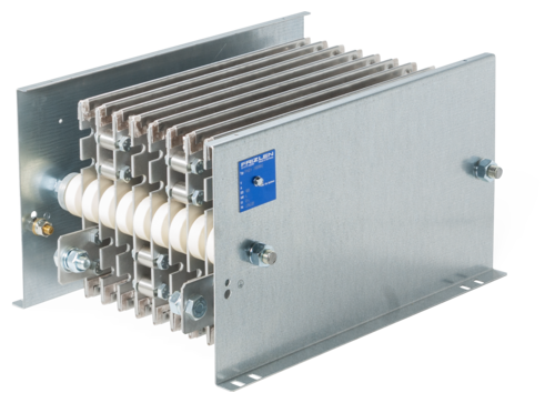 Stahlgitterfestwiderstandsblock in Schutzart IP 00 für hohe Energieaufnahme, mit Seitenteilen für den Einbau in Schaltschränke. Anschluss am Widerstand.Besondere Merkmale