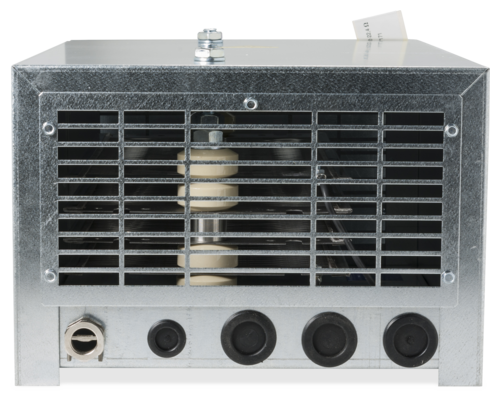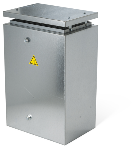Stahlgitterfestwiderstandsgerät in Schutzart IP 23 mit Wetterschutzdach, geeignet für Außenmontage, im verzinkten Stahlblechgehäuse für Anschluss an 2 Klemmen, mit mehreren Bohrungen für Kabeleinführungen, die durch Gummitüllen verschlossen sind.Besondere Merkmale